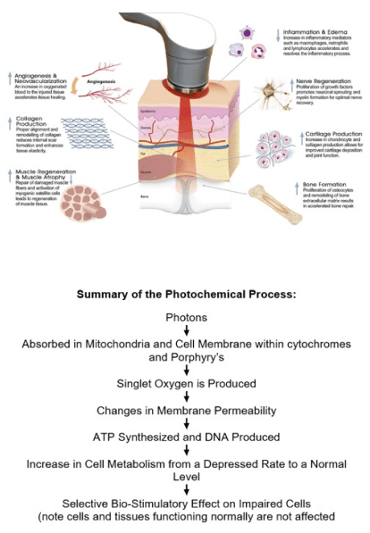 Research shows that laser irradiation causes enzymes within cells to absorb light energy. Visible red and near-infrared light are absorbed by mitochondria and cell membranes, increasing ATP production and DNA synthesis, which enhances cellular health and energy. This process reduces pain and inflammation and stimulates nerve regeneration, muscle relaxation, and immune responses. Normal tissues are unaffected because photons are only absorbed by cells needing repair.